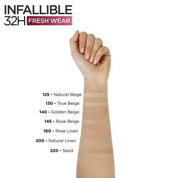 Meet L'Oreal Paris Infallible 32H Fresh wear foundation, with vitamin C. A full coverage yet lightweight foundation. It's transfer-proof and water-proof so you get more from your makeup. The innovative oxygen technology gives a lightweight feel whilst the ultra - stretchable formula ensures full coverage application - so a little goes a long way. Life doesn't compromise, so now your makeup doesn't either. SPF 25.
